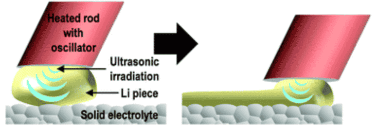 Li metal, which has a large theoretical capacity (3860 mA h g-1) and a negative potential (-3.04 V vs. standard hydrogen potential), is regarded as the ultimate anode material. All-solid-state batteries using inorganic solid electrolytes (ISEs) and Li metal are expected to be next-generation batteries with high safety and high energy density. batteries with high safety and high energy density. Therefore, techniques to effectively bond Li metal to ISEs in a short time by a simple process are important in the research on Li-ion batteries. Therefore, techniques to effectively bond Li metal to ISEs in a short time by a simple process are important in the research on Li-ISE batteries. this report, we demonstrate a new strategy for rapidly joining Li metal and an ISE using ultrasonic waves - the ultrasonic-assisted thermal fusion bonding method. We found that ultrasonic irradiation helps in the interface formation between Li and the ISE, and the joining process finishes in just a few seconds. The obtained interface showed a low resistance and could be used under a high current density. The development of prototype cells was promoted by this ultrafast process. This technology, which easily creates an electrochemically favourable Li-ISE interface, liberates people from the hassle of Li and the ISE. This technology, which easily creates an electrochemically favourable Li-ISE interface, liberates people from the hassle of Li anode fabrication and will promote the realization of next-generation batteries and the utilization of electric vehicles.