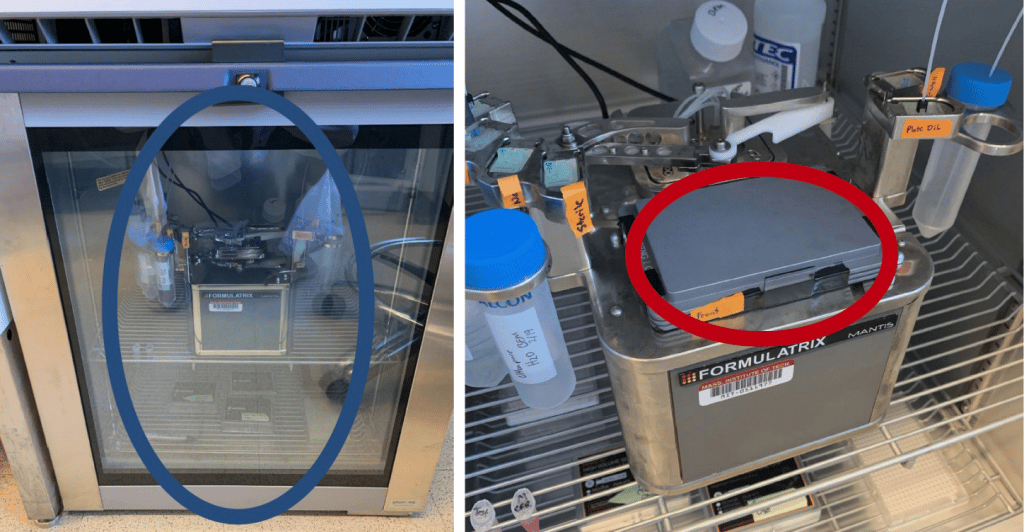 Рисунок 3. MANTIS® занимает очень мало места и может быть запечатан в среде с контролируемой температурой. Помещение MANTIS® в холодильник во время этого испытания позволило инокулировать пластины Matrigel® на нагретую поверхность при температуре 4°C (серый = холод, красный = тепло). Это идеальные условия для формирования купола Matrigel®.