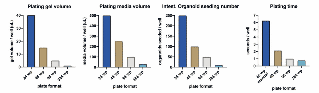 Рисунок 4. MANTIS® значительно снижает потребность в реагентах, включая объем Matrigel® на лунку, объем среды для инокуляции и количество органоидов кишечника, подлежащих инокуляции, а также сокращает время инокуляции.